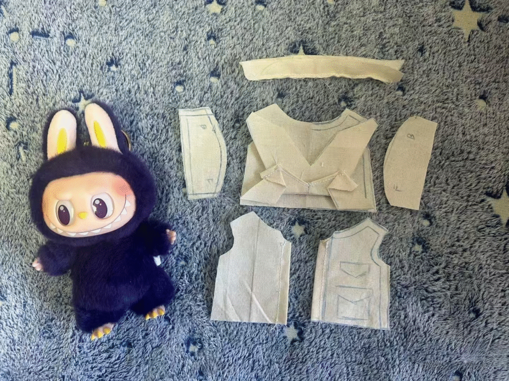 Inspiration suddenly struck: Encountering the creative opportunity At the very beginning, looking at the fluffy Labubu on the table, I always thought of giving it a different style. By chance, I was attracted by the casualness and retro feel of the denim fabric. Instantly, the image of creating a cool and stylish denim outfit for Labubu emerged in my mind. Thus, this journey of creating baby clothes officially began.