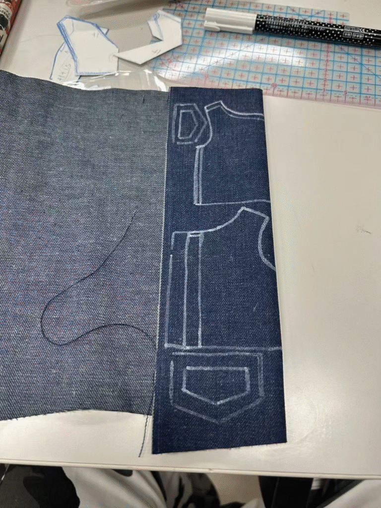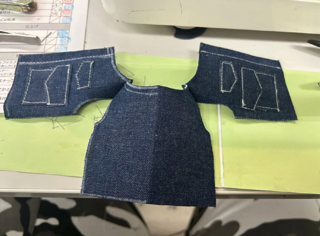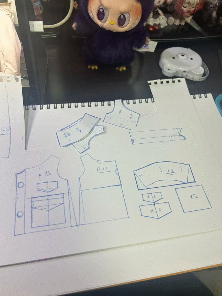 Fabric selection: Touch texture and temperature fabric are the foundation of children’s clothing. In order to find suitable denim, I visited many fabric markets. The final selected denim fabric has a crisp texture yet remains soft, with rich colors and a retro, aged feel. Touching the fabric, one can imagine what kind of coolness it will add to Labubu when it turns into clothes. In addition to denim, a soft lining was also selected to make Labubu comfortable and snug when worn.